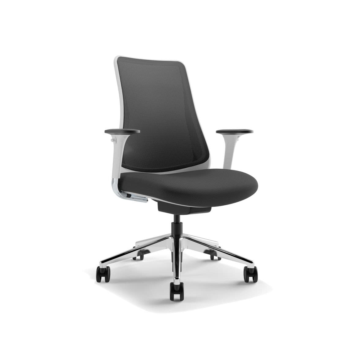 This modern, ergonomic office chair design is a high performance task series that offers a single, versatile mid back size with three seat sizes (including petite). The back frame design offers upper thoracic mobility and scapular release – creating opportunities for the user to move freely within the confines of a smaller workstation set up. The mesh (back) is elastomeric, 4-way stretch offering optimal spine support and long term comfort. It can be specified with a high performance syncro control with side mounted back tension control with options of seat slide or simple to use swivel tilt control. Arm options range from full function height, width and arm cap rotation, to a nicely designed fixed conference/training arm. Therefore, this modern office chair is a great cross over series from task to conference.