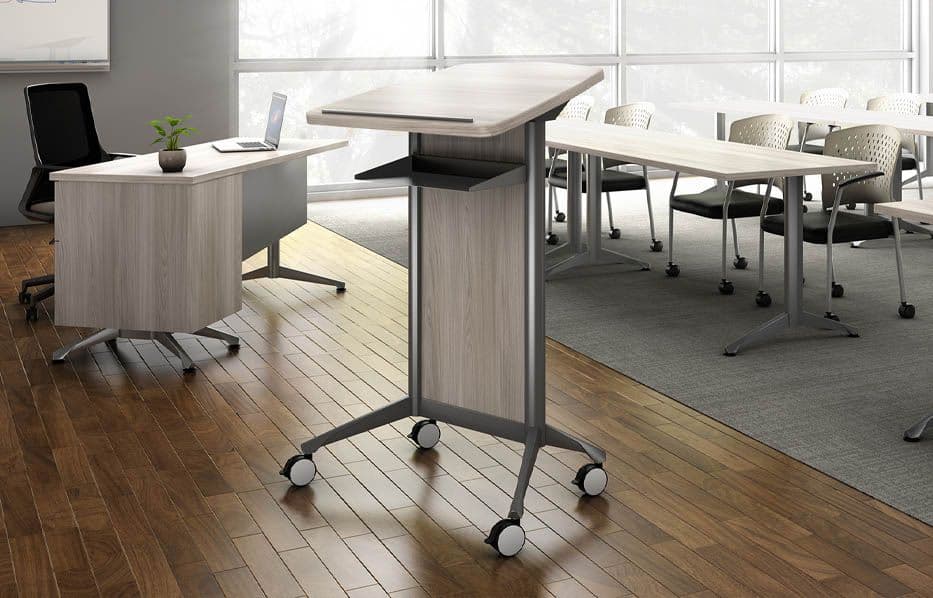 Every aspect this flexible office space and training table series was thoughtfully designed from striking vertical uprights to feet that create a subtle layered effect. The comprehensive collection includes all the accessories needed to outfit a space, from lecterns and mobile marker boards to conference tables and height-adjusted command centers. This multipurpose table design allows anyone to revamp their spaces in minutes, changing table functions and layouts to empower group work or lectures whenever needed.