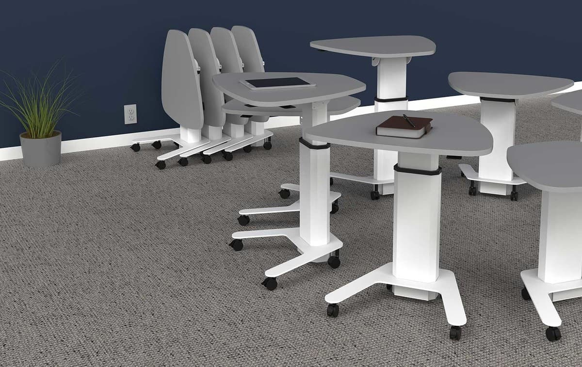 This modern nesting table can be moved within any space to accommodate social distancing while allowing for height adjustability, tilting, and an option for a built-in White Board surface for impromptu brainstorming. When finished, this nesting conferencing room and training room table can be easily sanitized after use and stacked away for the next big meeting.