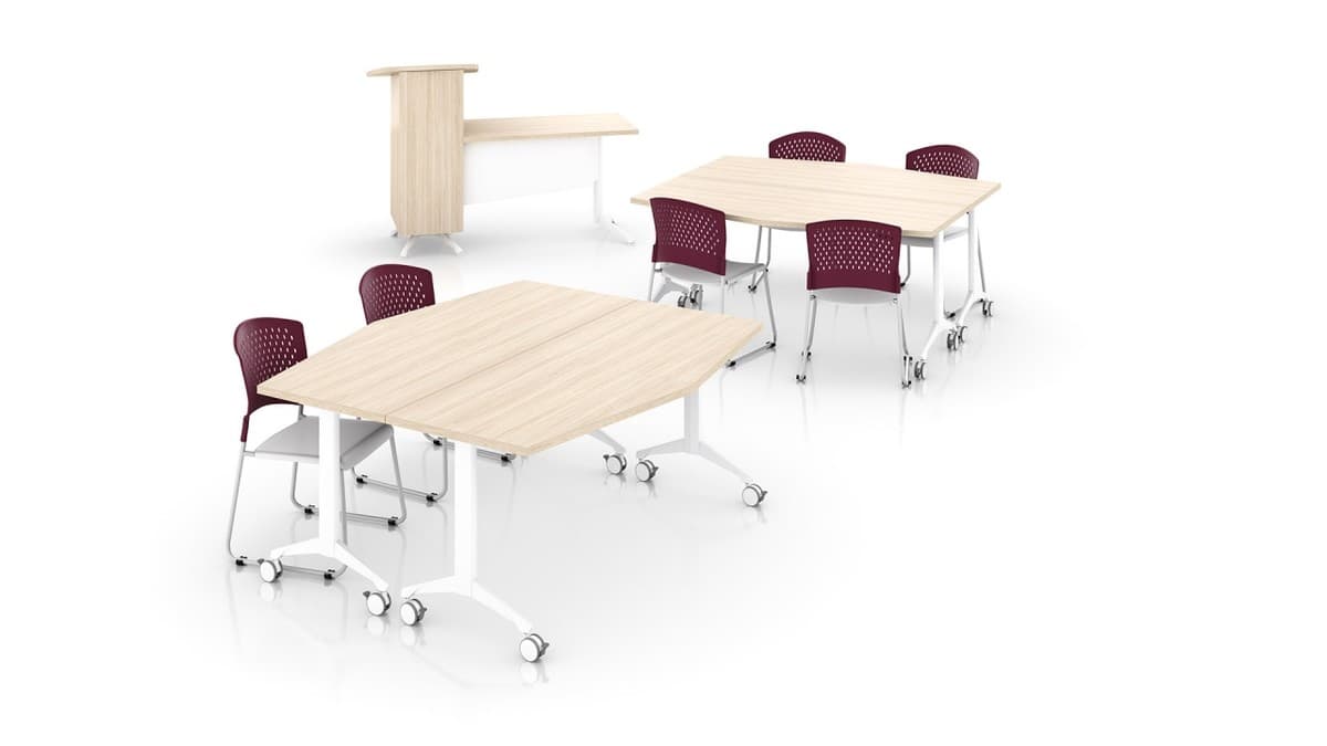 Every aspect this flexible office space and training table series was thoughtfully designed from striking vertical uprights to feet that create a subtle layered effect. The comprehensive collection includes all the accessories needed to outfit a space, from lecterns and mobile marker boards to conference tables and height-adjusted command centers. This multipurpose table design allows anyone to revamp their spaces in minutes, changing table functions and layouts to empower group work or lectures whenever needed.